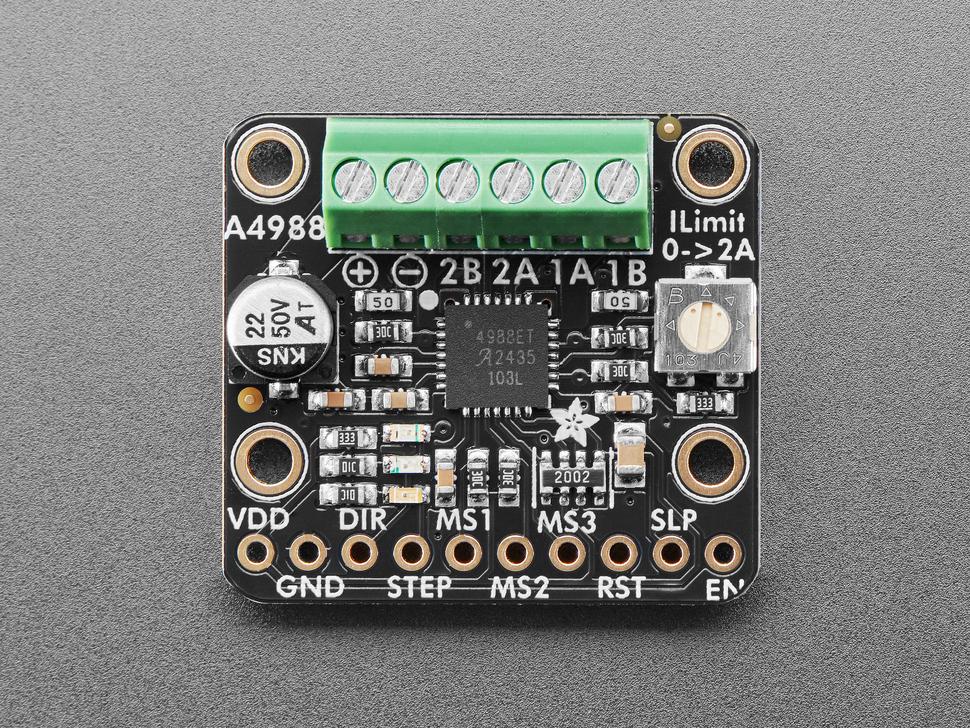 Dette breakout-kort er designet med den branchestandardiserede Allegro A4988 DMOS-mikrostepdriver og håndterer motorspændinger fra 8V til 35VDC og logikspændinger fra 3V til 5V. Klemmeskrueblokken muliggør problemfri tilslutning af motorstrøm og 4-leder bipolær stepper-ledningsføring.