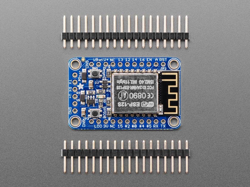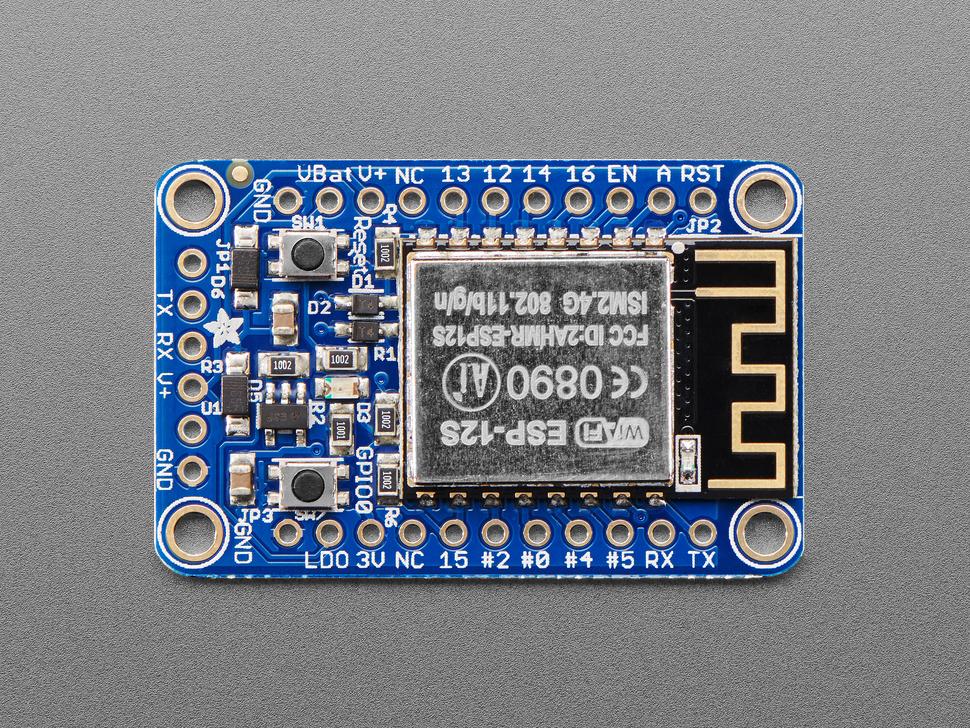 Adafruit HUZZAH ESP8266 breakout-kortet forenkler prototyping med denne chip ved at inkorporere et CE- og FCC-certificeret modul med indbygget antenne, nulstillings- og brugerknapper samt en rød LED. Det inkluderer en indbygget 500mA 3,3V regulator, hvilket gør det klar til at drive krævende projekter.