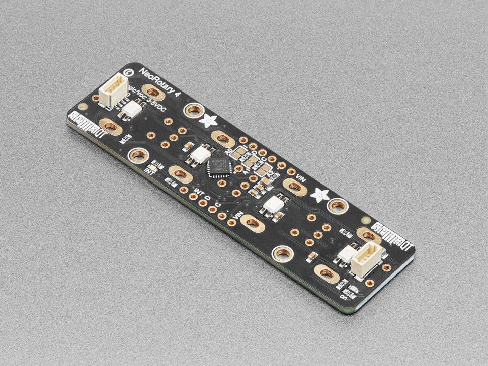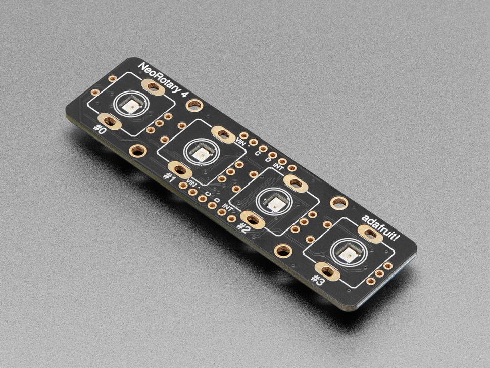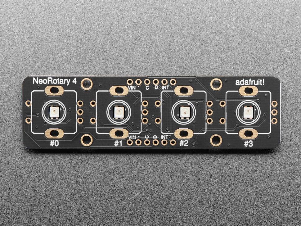 Disse LED'er har omvendt monterede NeoPixels til visuel feedback med gennemskinnelige akselencodere og styres via I2C. INT-pinden giver lave pulser ved rotation eller registrering af tryk på knapper, hvilket reducerer behovet for konstante I2C-aflæsninger.