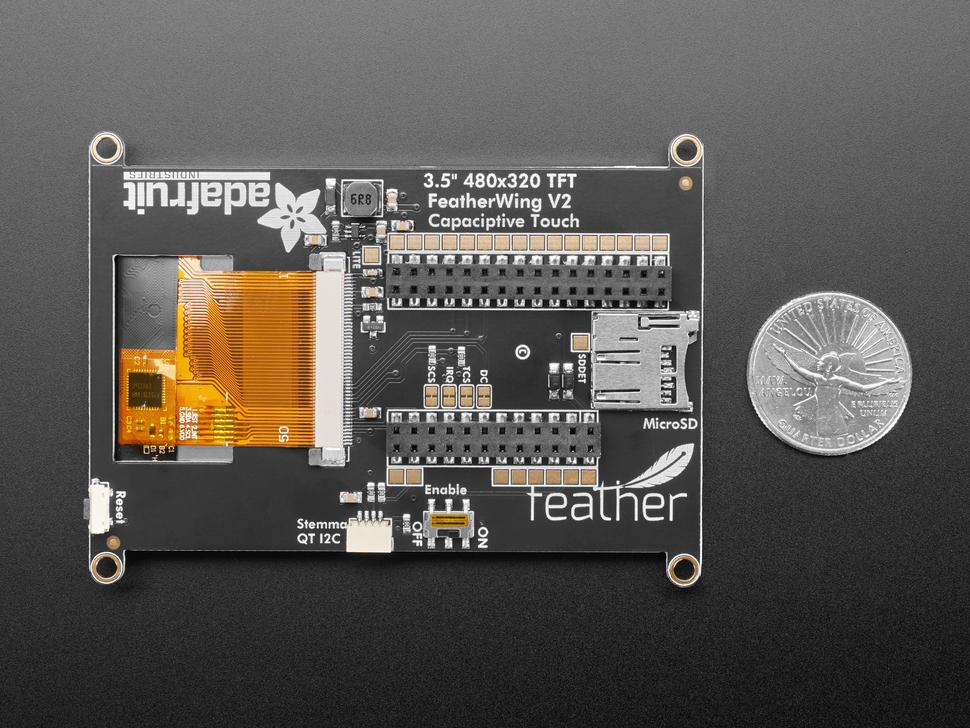 Pynt dit Feather-projekt med den livlige Adafruit TFT FeatherWing , en 3,5" skærm med 480x320 pixels med 16-bit farvekontrol. Dens hvide LED-baggrundsbelysning forbedrer synligheden, mens den kapacitive berøringsskærm registrerer op til fem fingertryk. Det indbyggede microSD-kortstik giver lagringsløsninger til ethvert billedbehov.