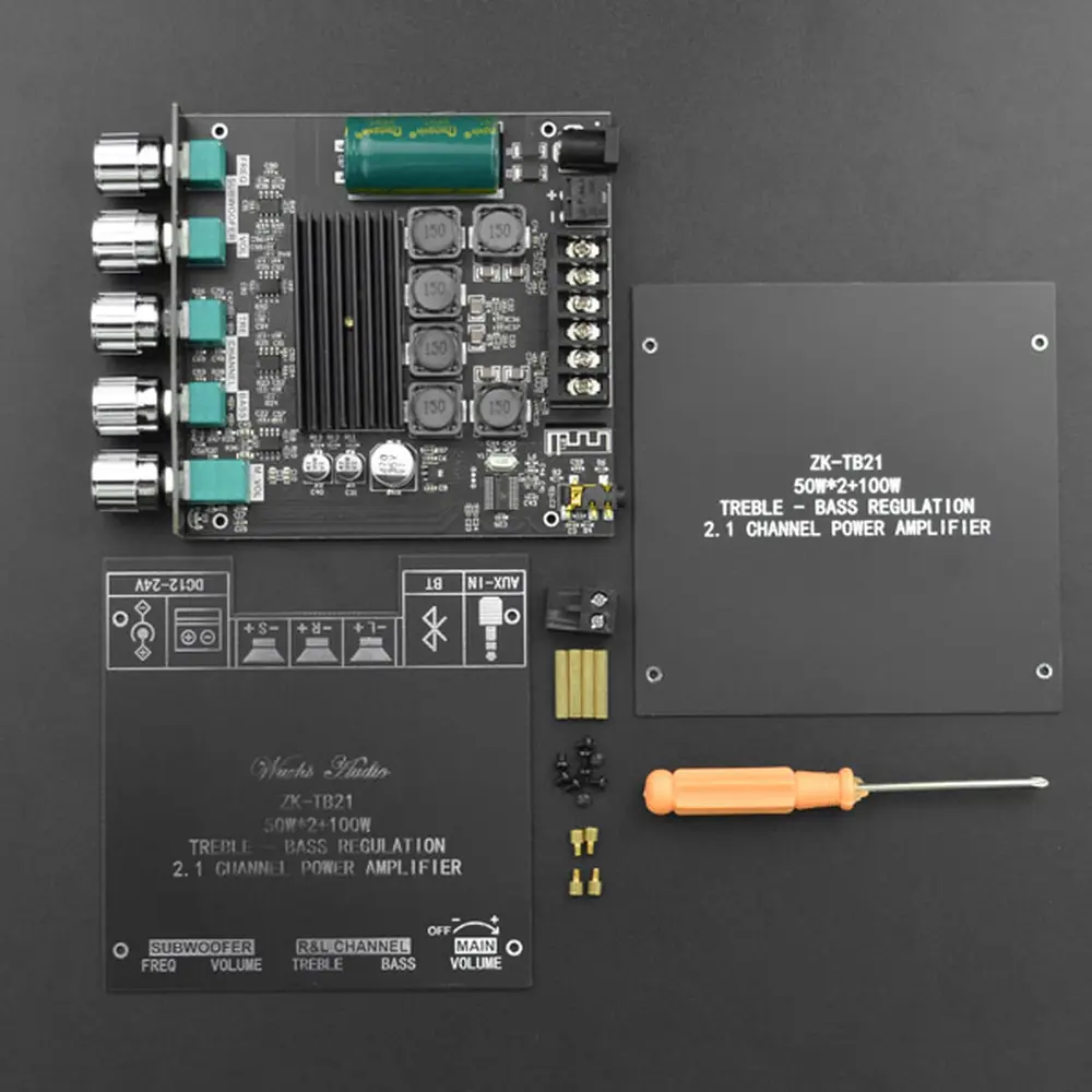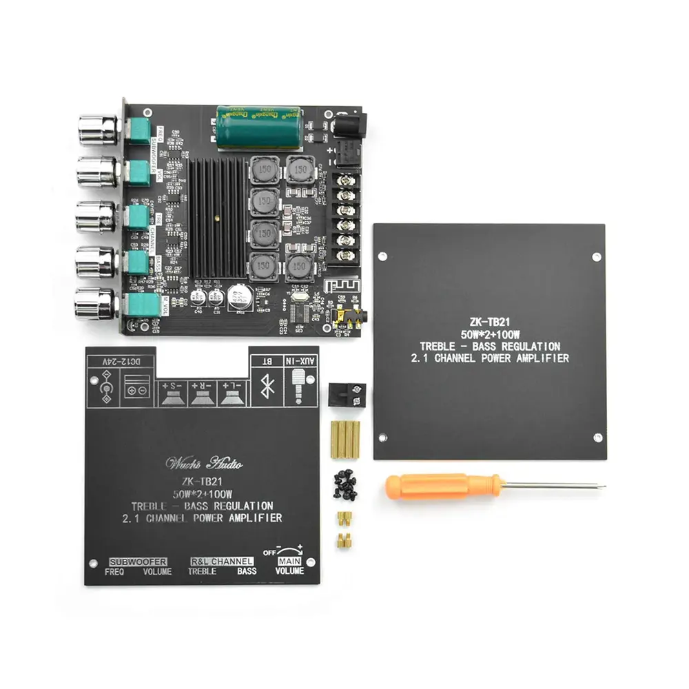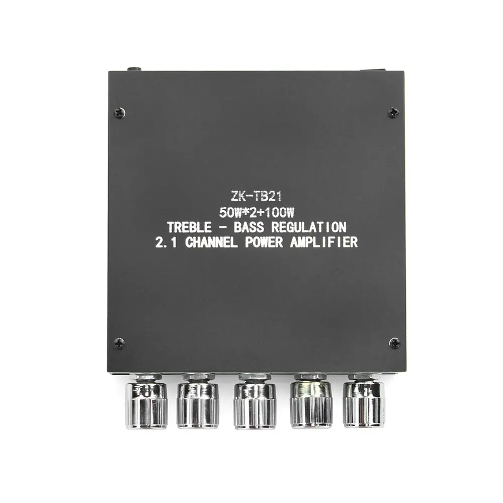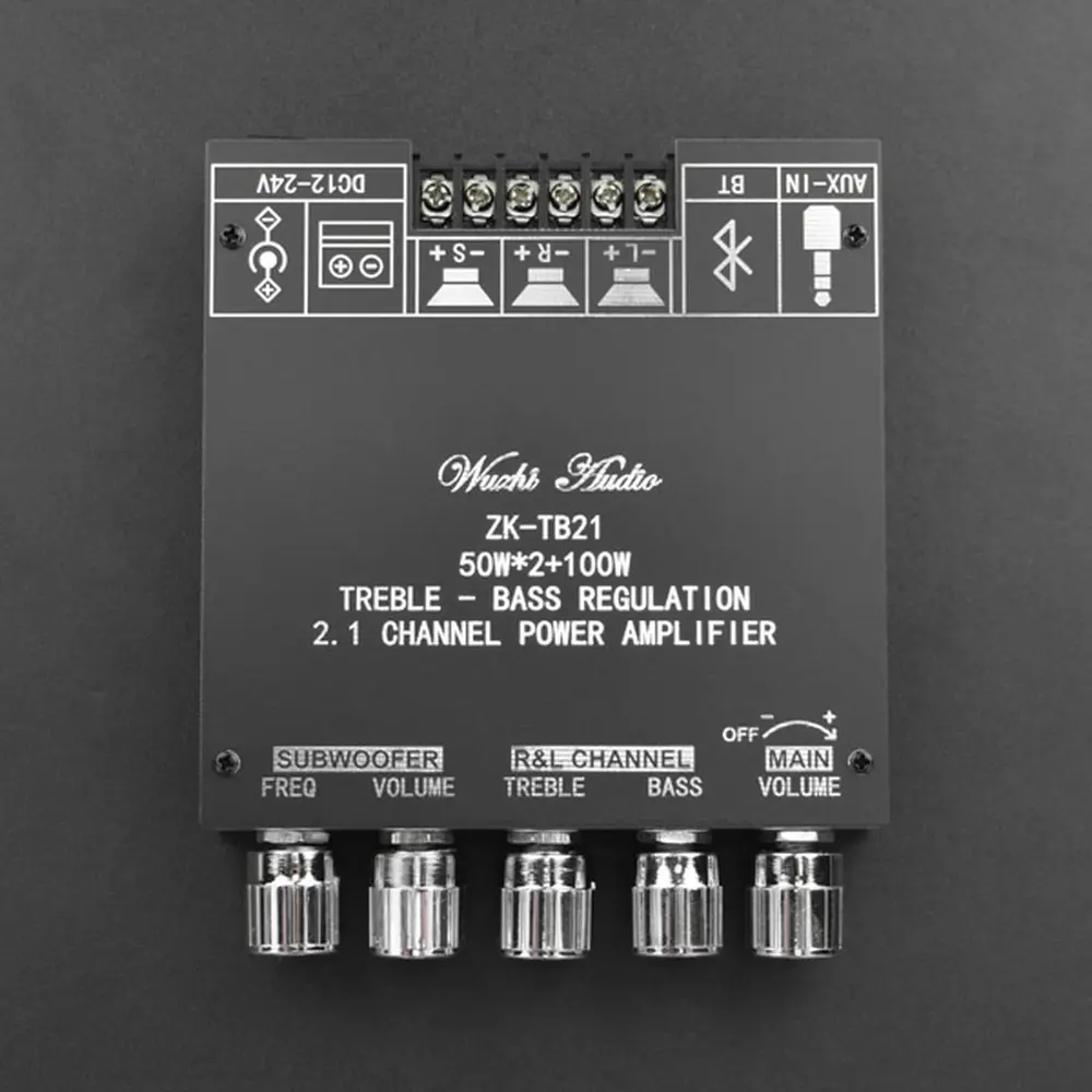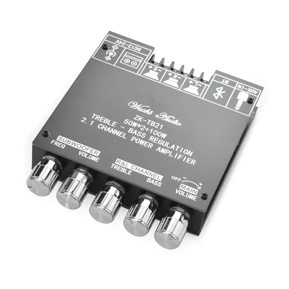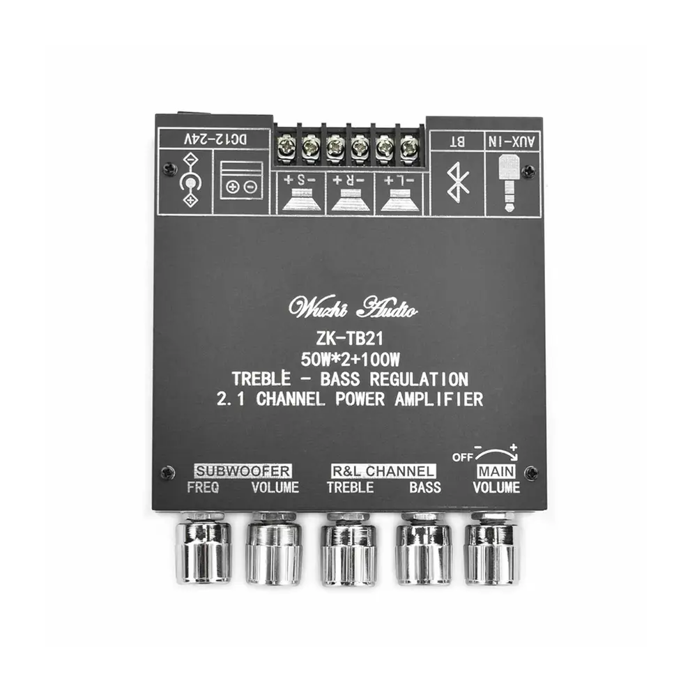Forstærkeren drives af en DC12~24V strømforsyning og understøtter både AUX- og Bluetooth 5.0 lydindgange. Med en robust 50W udgang til venstre og højre kanal og en imponerende 100W udgang til subwooferkanaler er den konstrueret til at forbedre din lydoplevelse. Dens fem justerbare knapper giver problemfri kontrol over effekt, hovedlydstyrke, bas, diskant, subwooferfrekvens og lydstyrke, hvilket optimerer din lytteoplevelse.