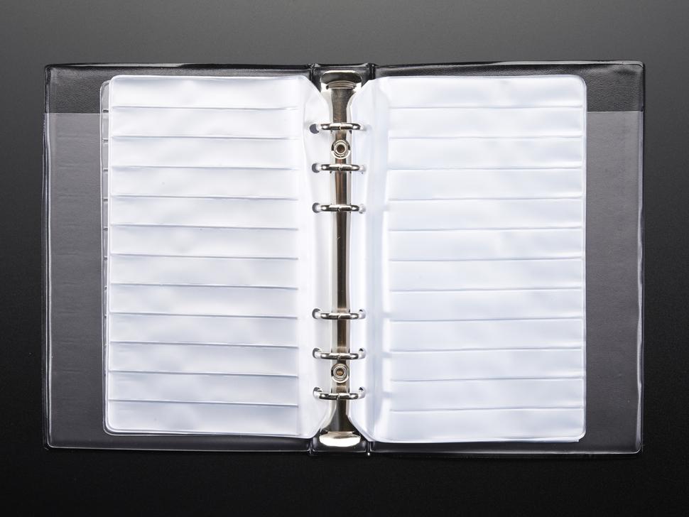 Dette søde hæfte med hårdt omslag forenkler opbevaringen af dine SMT-dele med sine gennemskinnelige flip-sider designet til at opbevare tapede komponenter. Det har 20 sider, der rummer 8 mm og 24 mm tape, de mest almindelige størrelser til elektronisk arbejde.