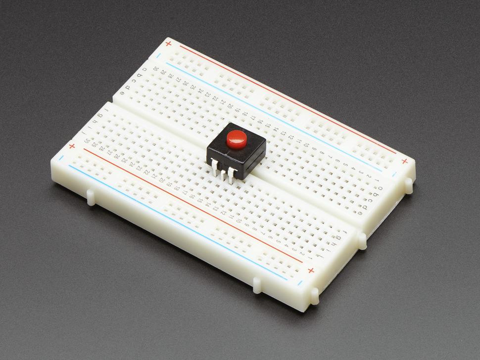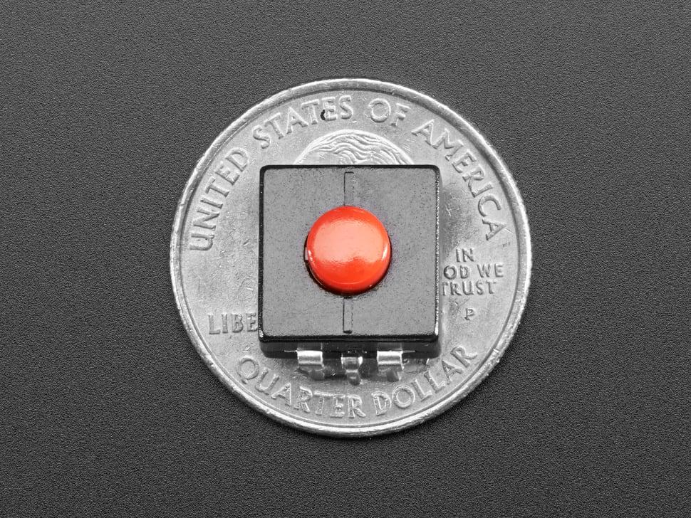 Pakken indeholder en switch med en top, der fås i rød eller sort, selvom farven kan variere. Begge knapper har identisk funktionalitet. Bemærk, at ledningerne ikke er perfekt justeret til et 0,1" gitter, så en let bøjning af dem gør det nemt at klikke dem fast i et loddefrit breadboard eller perfboard.