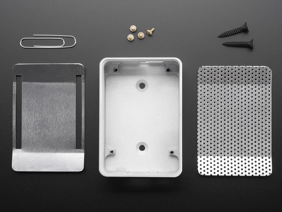 Pakken indeholder en bund i aluminium, to karakteristiske toppe, fire skruer til sikker montering, to skruer til vægmontering og en stor papirclips til nem fjernelse af toppen. Bemærk venligst, at BeagleBone Black-computeren ikke er inkluderet.